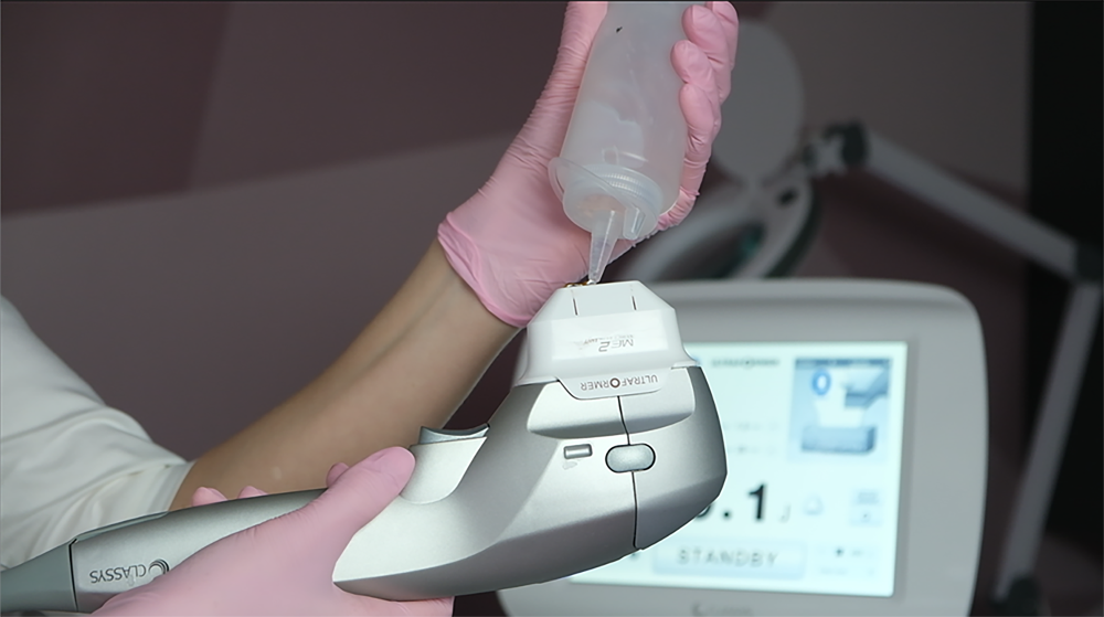 - Поверх разметки наносится контактный ультразвуковой гель, который снижает трение и улучшает скольжение насадки по коже.