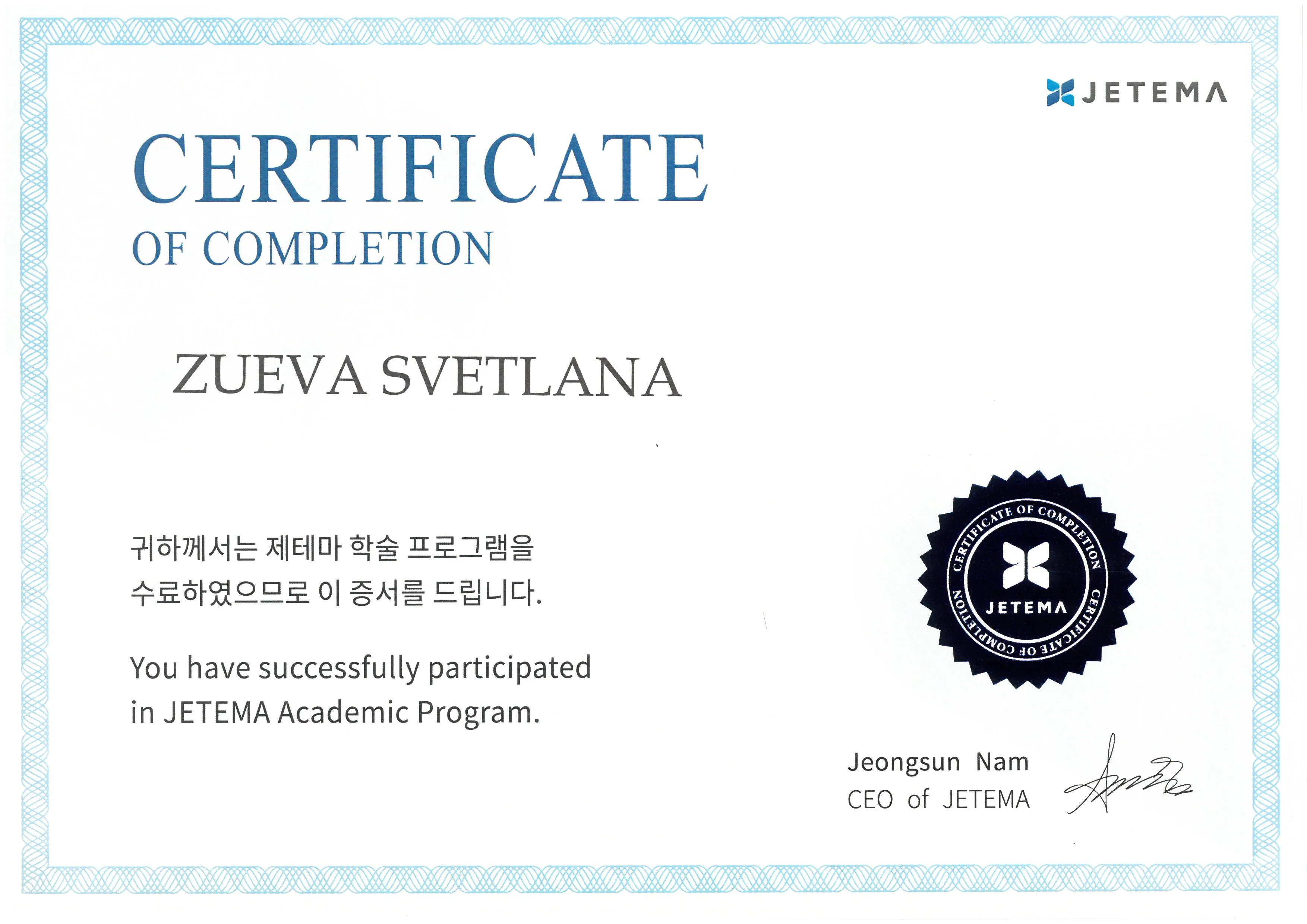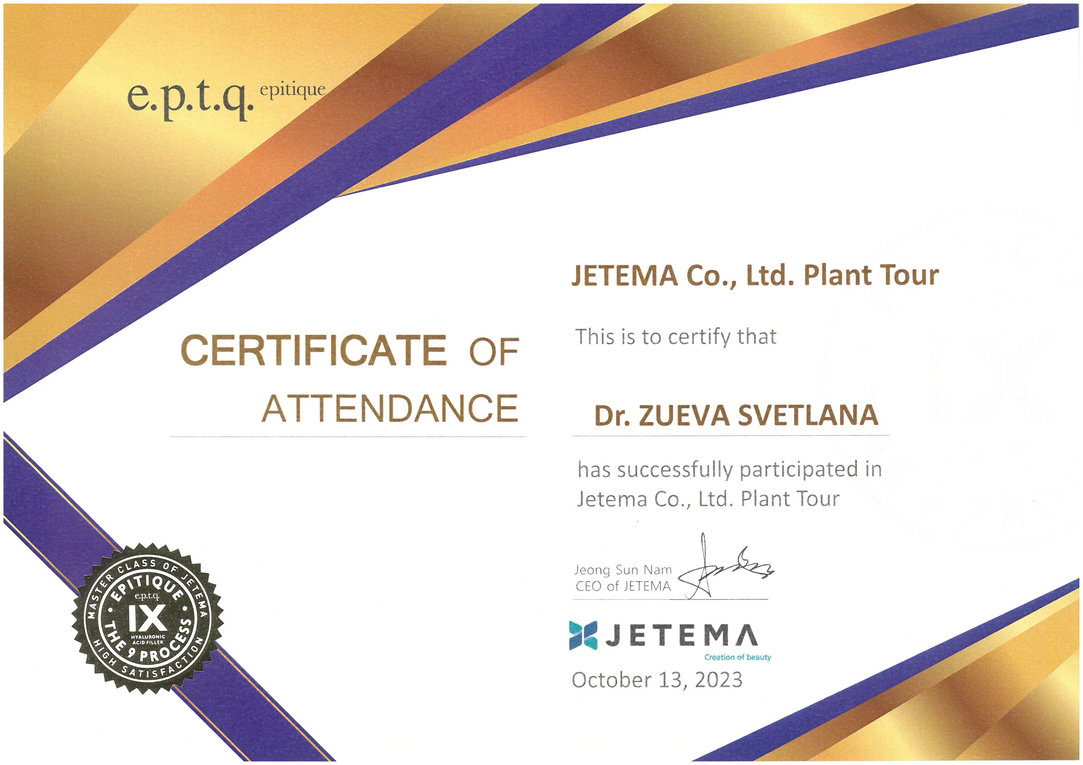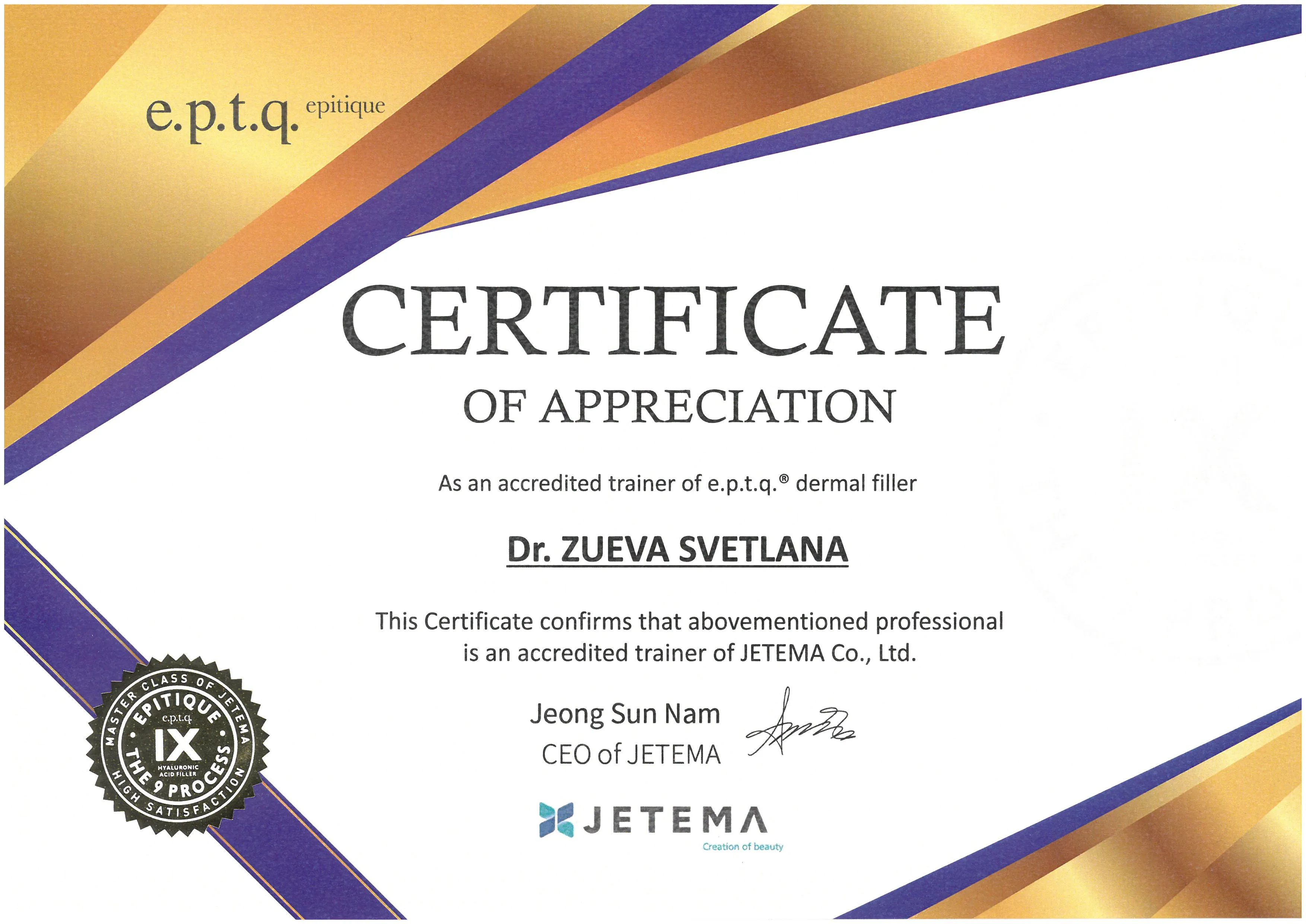 Сертификат о аккредитации в качестве тренера компании JETEMA (e.p.t.q dermal filler) | JETEMA