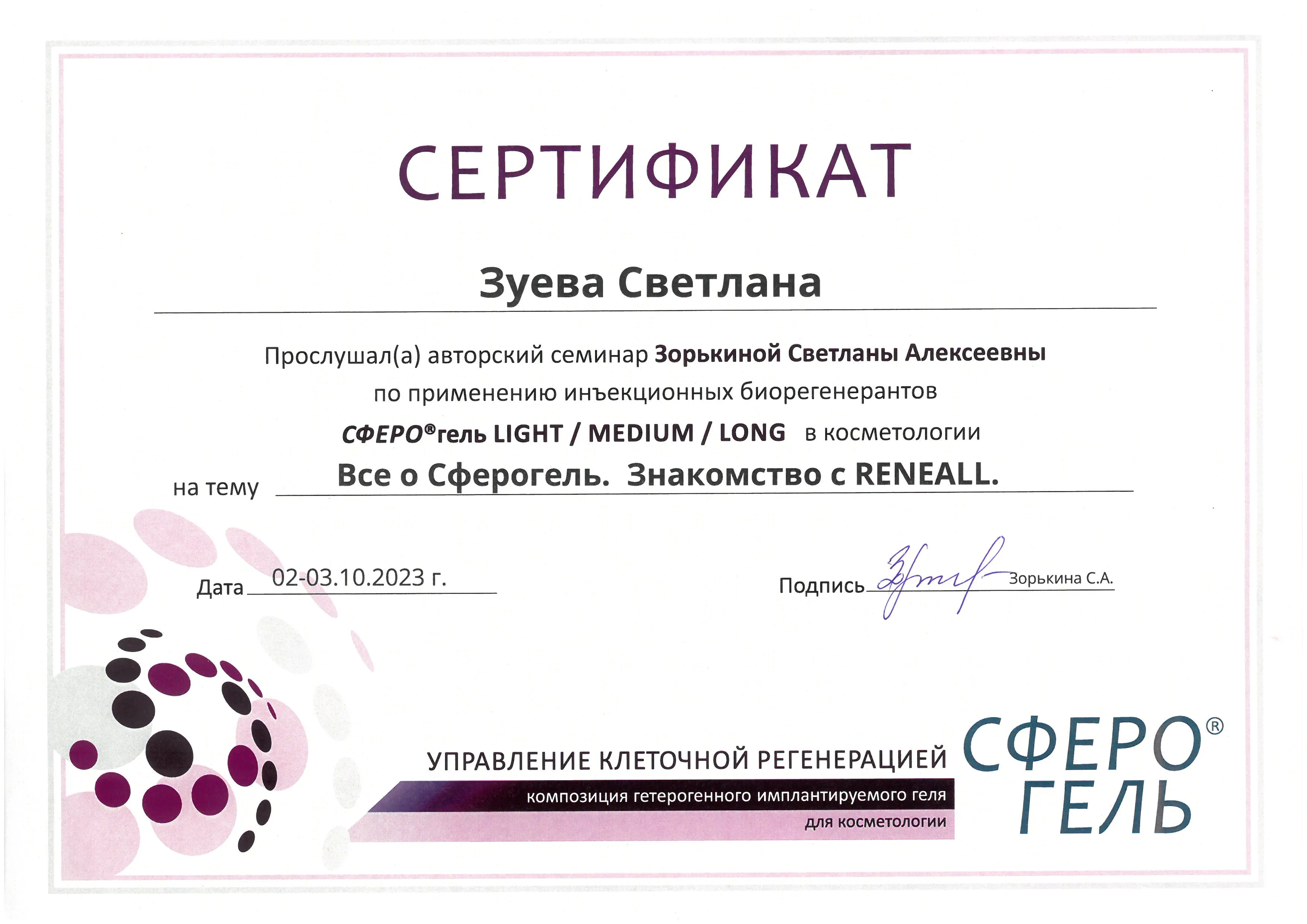Авторский семинар Зорькиной Светланы Алексеевны по применению инъекционных биорегенерантов СФЕРО гель LIGHT/MEDIUM/LONG в косметологии. Знакомство с RENEALL | Зорькина С.А.